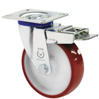 Діаметр коліс:80мм, 100мм, 125мм, 150 мм, 200мм Вантажопідйомність: 120-600 кг Кронштейн: пресований полірований з листової нержавіючої сталі. Нержавіючих дворядний шарикопідшипник в поворотному вузлі. Підшипник захищений пластиковим пилюжником. Ось колеса і болт з гайкою виготовлені з нержавіючої сталі. Гальмівний механізм, встановлений на кронштейнах, блокує поворотний вузол і одночасно фіксує обертання колеса. Всі елементи гальмівної системи виконані з нержавіючого металу.